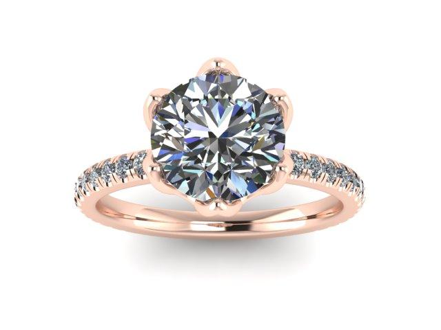 Our Delicate Olivia design in 18kt white gold featuring a 2ct round lab grown diamond surround by floral inspired prongs that embrace beauty from all angles. VS/F, 2.50ctw.