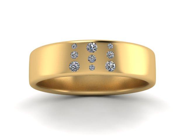 14Kt royal yellow gold band with "9" round lab grown diamonds set in a tapered pattern. VS/F, .15ctw.