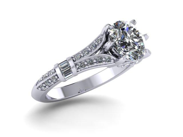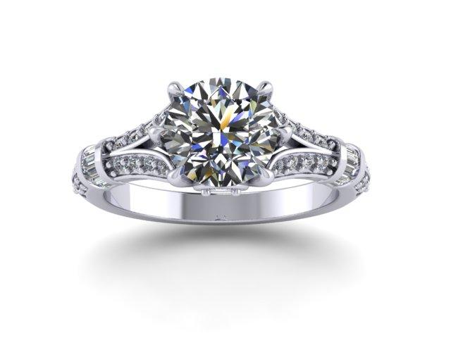 Vintage Split Shank design set with a 1.50ct Round Lab Grown Diamond in center. The ring mounting contains .37 ctw of round and baguette brilliant Lab Grown Diamonds. VS clarity and FG color.